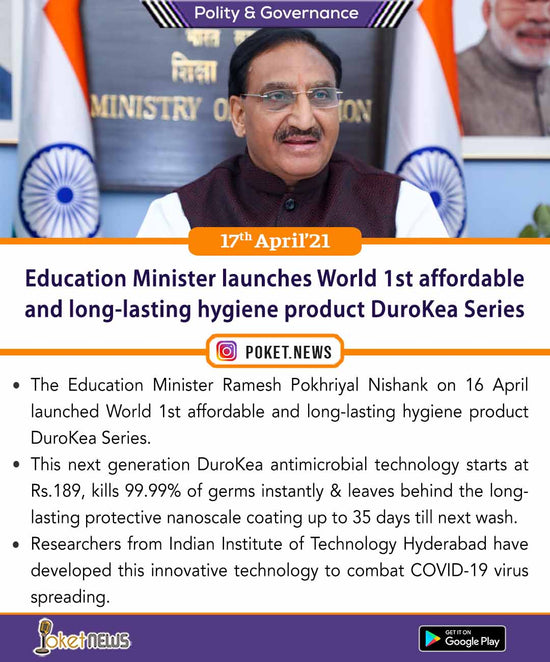 DuroKea Series: Union Minister of Education launched “World 1st affordable and long-lasting hygiene product DuroKea Series”, developed by IIT Hyderabad researchers.