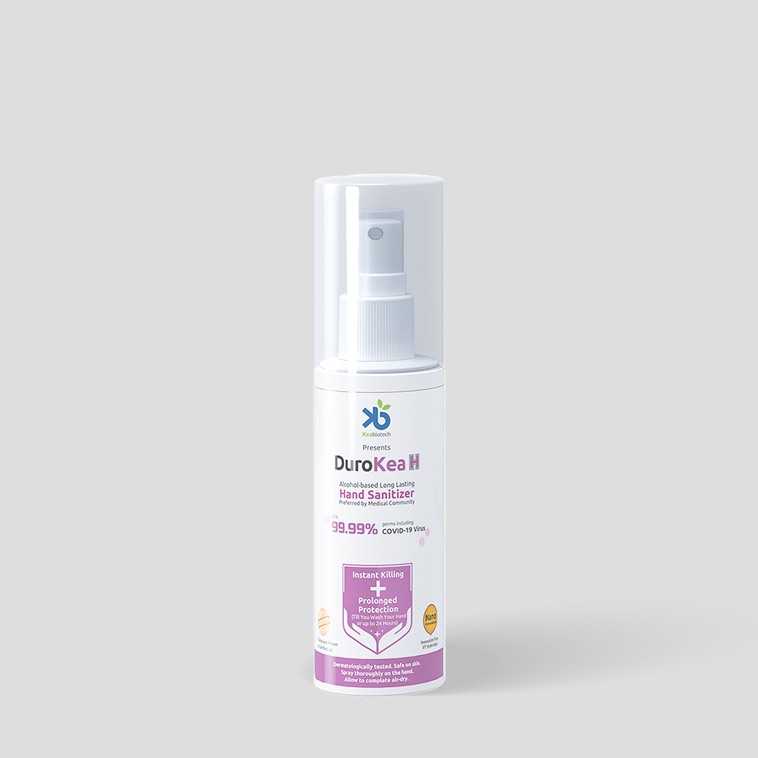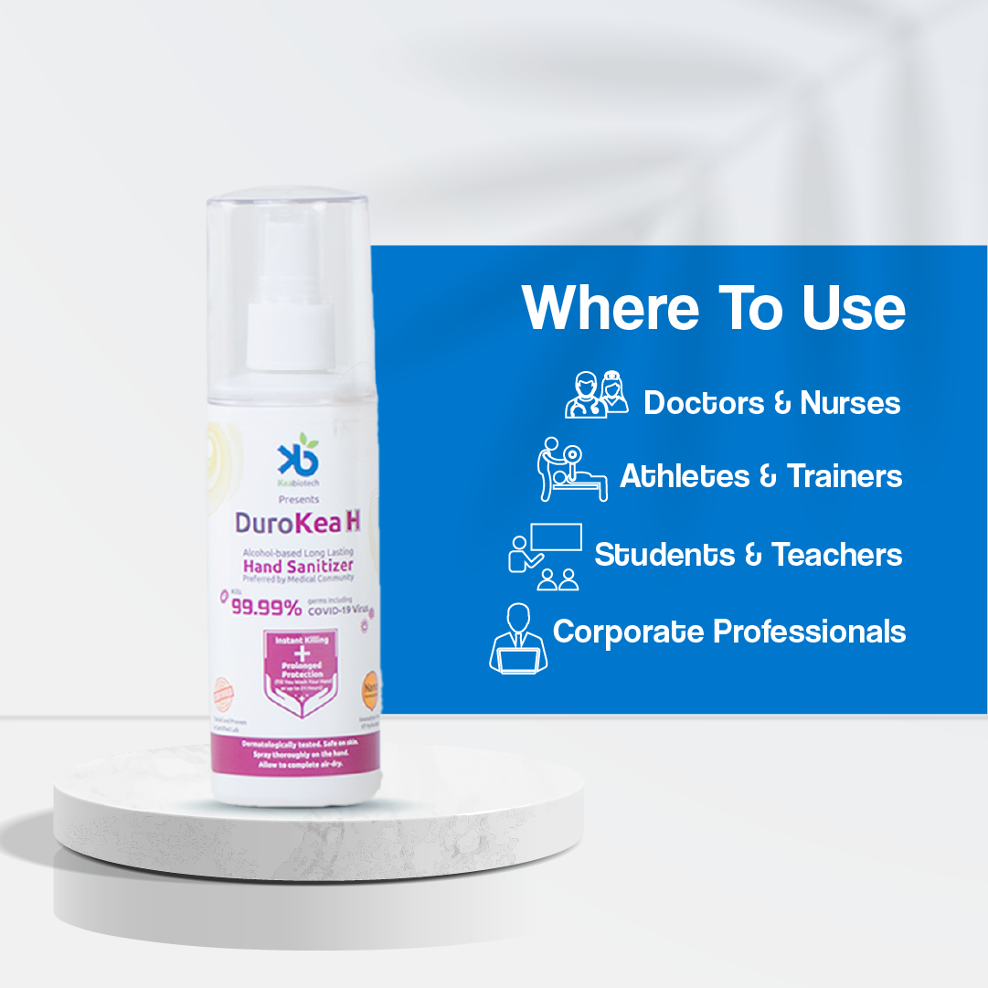 Spray 2 to 3 ml of DuroKea H thoroughly on your hand, and cover the hand adequately with the liquid. Gently rub. Allow it to air dry completely. Kids can also use it when they are out for school and playground under adult supervision. Keep out of reach of children below 5 years, for external use only. Avoid contact with eyes. If accidental contact occurs, rinse thoroughly with water.