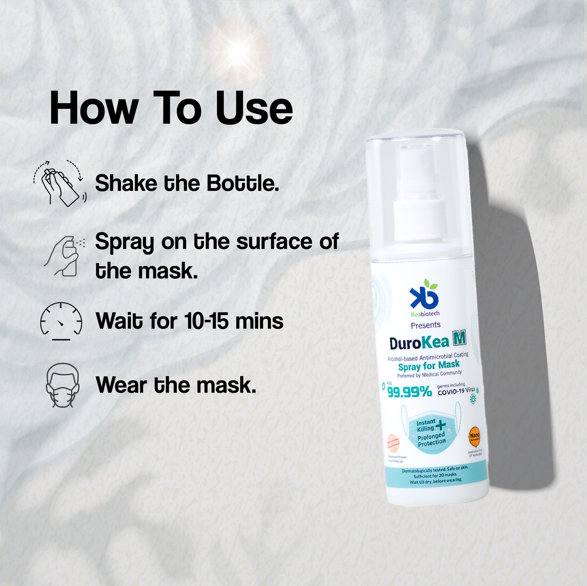 Durokea M is a novel nano formulation-based spray for masks. It kills 99.99% of germs instantly, including the COVID-19 virus and makes the mask's nanoscale coating for further protection until it is washed or discarded. Its alcohol droplets instantly kill all kinds of pathogens, including viruses, and leave behind the nano-coating, which provides long-lasting protection.