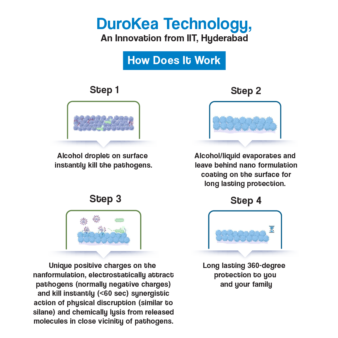 DuroKea S is the only long-lasting (up to 35 Days) Surface Disinfectant product available in the current market, which is alcohol-based. Once you apply it, its alcohol component instantly (in less than 30 seconds) kills germs. Volatile alcohol evaporates and leaves a nano-formulation coating on hard and soft surfaces. It is safe for the skin as the ingredients used are all approved by FDA in the USA for cosmeceutical use. The skin irritation test has been performed by NABL accredited laboratory and certified as safe on the skin.